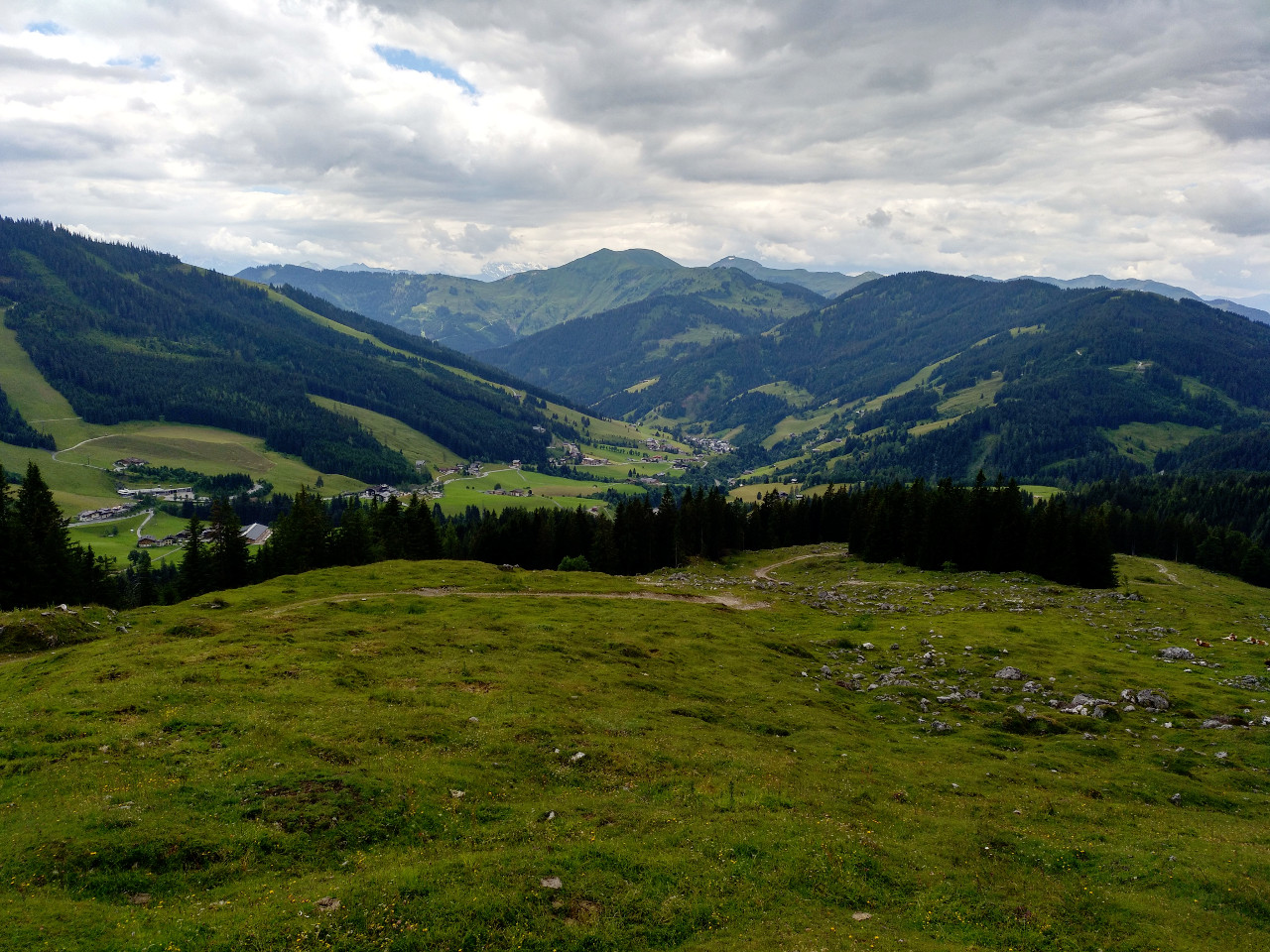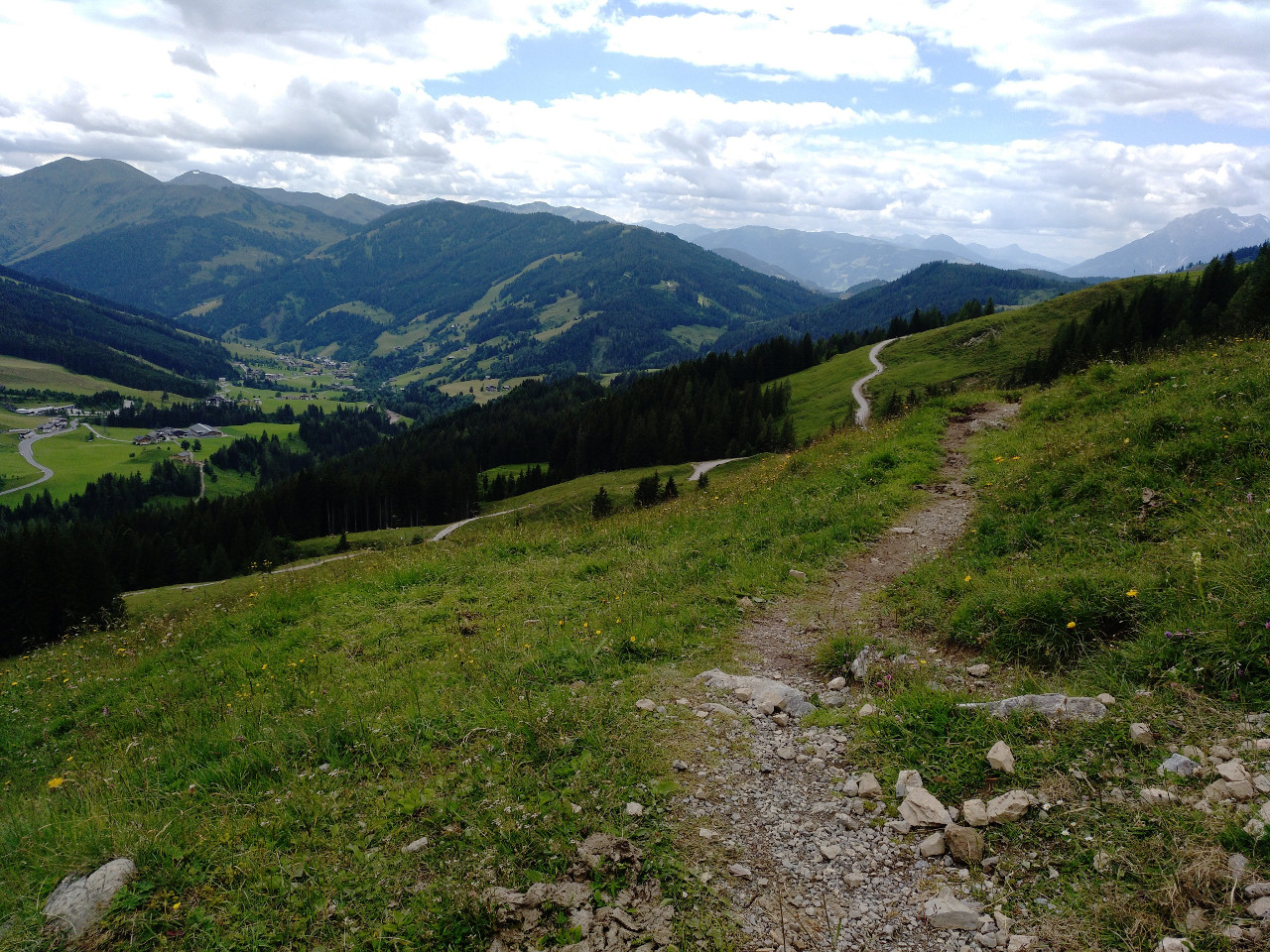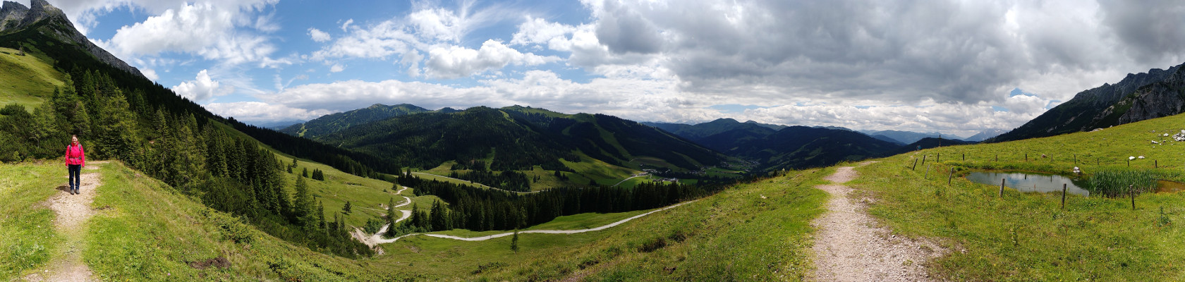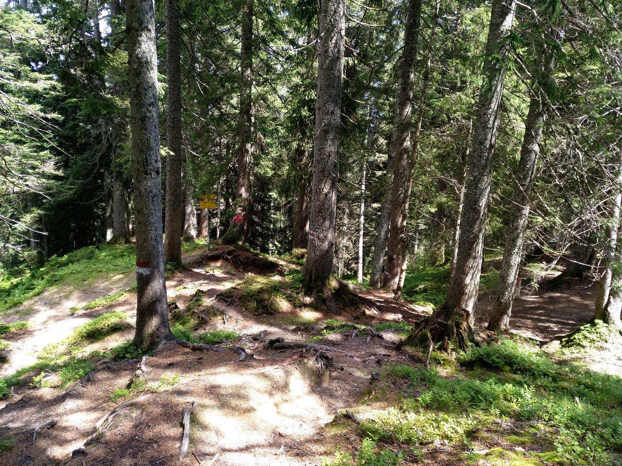 Hier geht es den Berg hinab zur Dientalm, und die Gabelung hat durchaus Potenzial, die falsche Richtung zu nehmen. Das wäre aber nicht weiter tragisch, denn man kommt auch über den Umweg über die Stegmoosalm wieder zurück, das dauert wohl nur etwa 45 Minuten länger.
